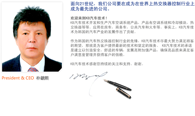 作为韩国的汽车热交换器控制行业的先锋,KB汽车技术尽最大努力满足顾客的期望,那就是为客户提供最新的技术和坚定的服务。 KB汽车技术的承诺是建立以创造安全,舒适的车辆,发展高附加值产品,确保高品质来满足客户满意度管理并获得客户的信赖。