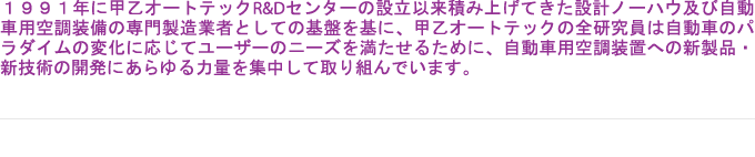1991年に甲乙オートテックR&Dセンターの設立以来積み上げてきた設計ノーハウ及び自動車用空調装備の専門製造業者としての基盤を基に、甲乙オートテックの全研究員は自動車のパラダイムの変化に応じてユーザーのニーズを満たせるために、自動車用空調装置への新製品・新技術の開発にあらゆる力量を集中して取り組んでいます。
