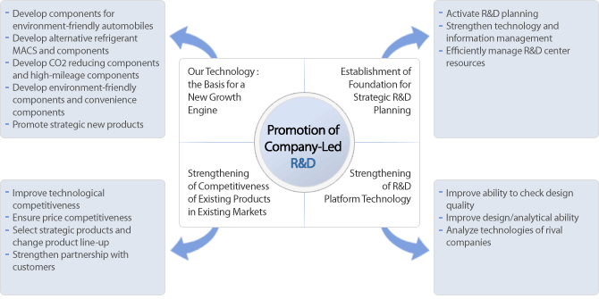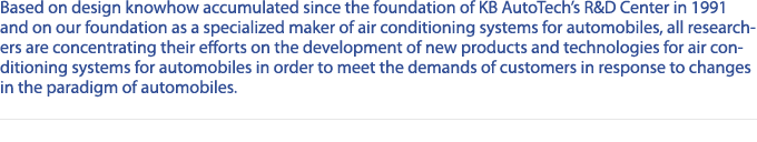Based on design knowhow accumulated since the foundation of KB AutoTechs R&D Center in 1991 and on our foundation as a specialized maker of air conditioning systems for automobiles, all researchers are concentrating their efforts on the development of new products and technologies for air conditioning systems for automobiles in order to meet the demands of customers in response to changes in the paradigm of automobiles.