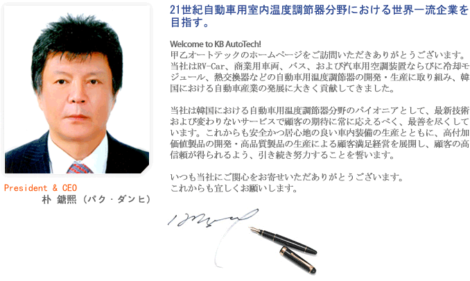当社は韓国における自動車用温度調節器分野のパイオニアとして、最新技術および変わりないサービスで顧客の期待に常に応えるべく、最善を尽くしています。これからも安全かつ居心地の良い車内装備の生産とともに、高付加価値製品の開発・高品質製品の生産による顧客満足経営を展開し、顧客の高信頼が得られるよう、引き続き努力することを誓います。