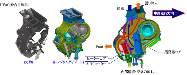 HVAC(暖房、喚起およびエアークーリング)はエンジン冷却水を熱源とするヒーターコアと冷媒の潜熱蒸発に利用する冷却蒸発器、そしてこれらの熱交換器に空気を送る送風機バレル(blower barrel)などから構成され、キャビン内の温度制御(冷暖房)および曇り・湿気の除去機能を負います。
