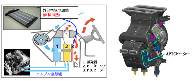 最近は高性能ディーゼルエンジンの出現によってヒーターのエネルギー源であるエンジン発熱量の減少によるヒーターの性能低下が問題になっています。これの対策として、流れてくる空気によって低下されたヒーターの性能を補うために、自動車の電気エネルギーを利用して空気を加熱しています。