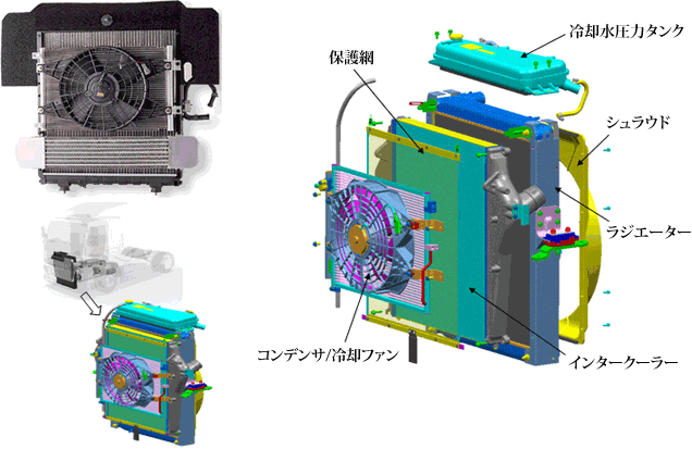 冷却モジュールは空調装置のコンデンサー、ラジエーター、インタークーラー、ファンなどから構成され、自動車の前側に装着されて様々な流体(例:空調装置の冷媒、エンジン冷却水、オイル、エンジンからの吸入空気など)を適切な温度に維持する機能をします。自動車会社はこれら装置のモジュール化によって構成パーツ数、重量、および工程数の削減効果を得ています。